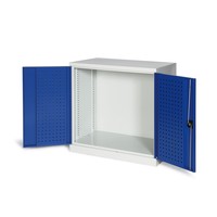 • Außenmaße H × B × T: 1000 × 1000 × 600 mm • Gesamttraglast: 900 kg • Türen mit Quadratlochung für Werkzeughalter • Lackierung: Korpus RAL 7035, Lichtgrau, Türen RAL 5010 , Enzianblau